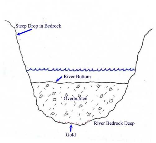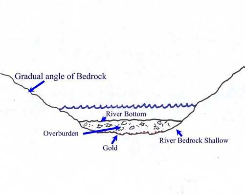 As stated earlier, gold being the heaviest of the materials in a river, combined with the agitation of all of the materials in the river at flood stage, will drive the gold to the bottom. The bottom of the river is bedrock. The bedrock may be shallow, and have very little "overburden" on it (or even be exposed), or it may be deep (30 or 40 feet or more under the overburden). Since the gold will be resting on the bedrock, you must be able to reach bedrock where you are dredging. Keeping all of the previous criteria in mind, look for an area that has bedrock shallow enough for you to work.