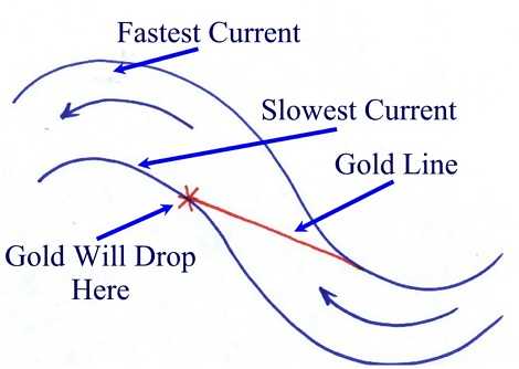 As the gold continues to be pushed down river, the gold that is farthest to the outside of a curve is pushed around the curve. That gold that is closest to the inside of a curve will tend to drop where the water begins to slow down at the beginning of the curve. This is also a good spot to look for gold.