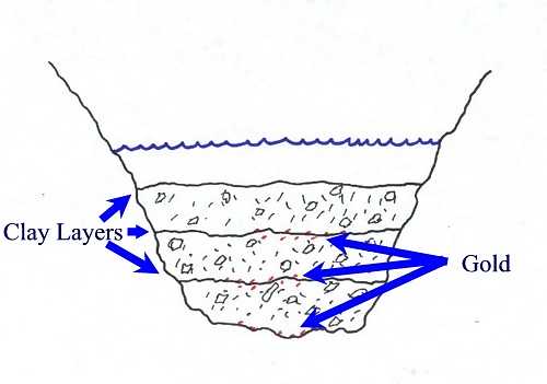 The bedrock at the bottom of the river is not the only place you will find gold, however. When the bedrock is deep, there will be clay layers that form at intervals from the river bottom to bedrock.
