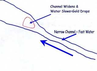 Gold moves when water pressure is high enough to overcome the weight of the gold. When the water pressure decreases, gold stops. It can hide behind an object that has broken the flow of water, or it can fall into a crack or crevice and hide from the water pressure. It can also stop when water slow down to flow around the inside of a curve. A fourth place is where the river widens into an area of slow moving water (commonly called a pool).